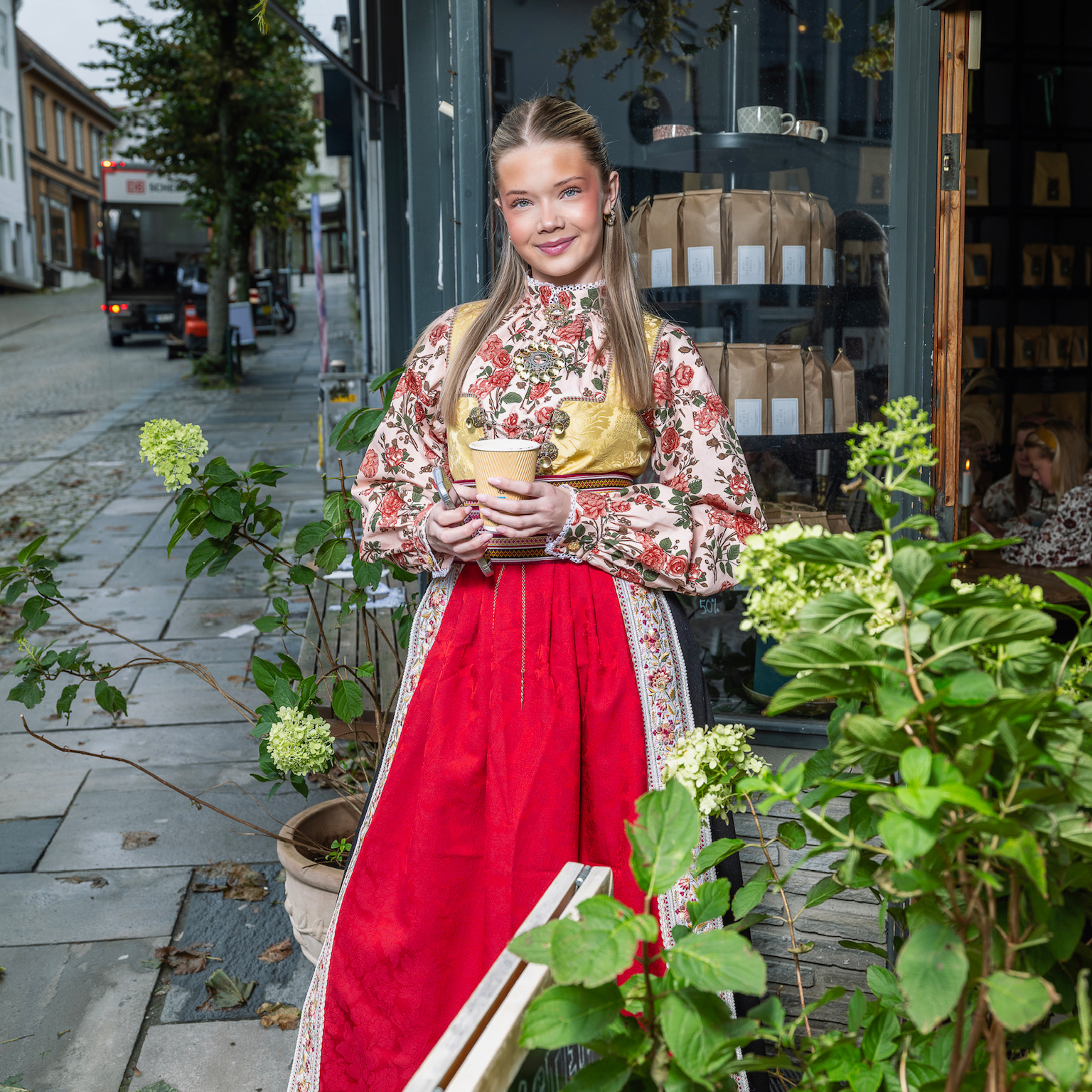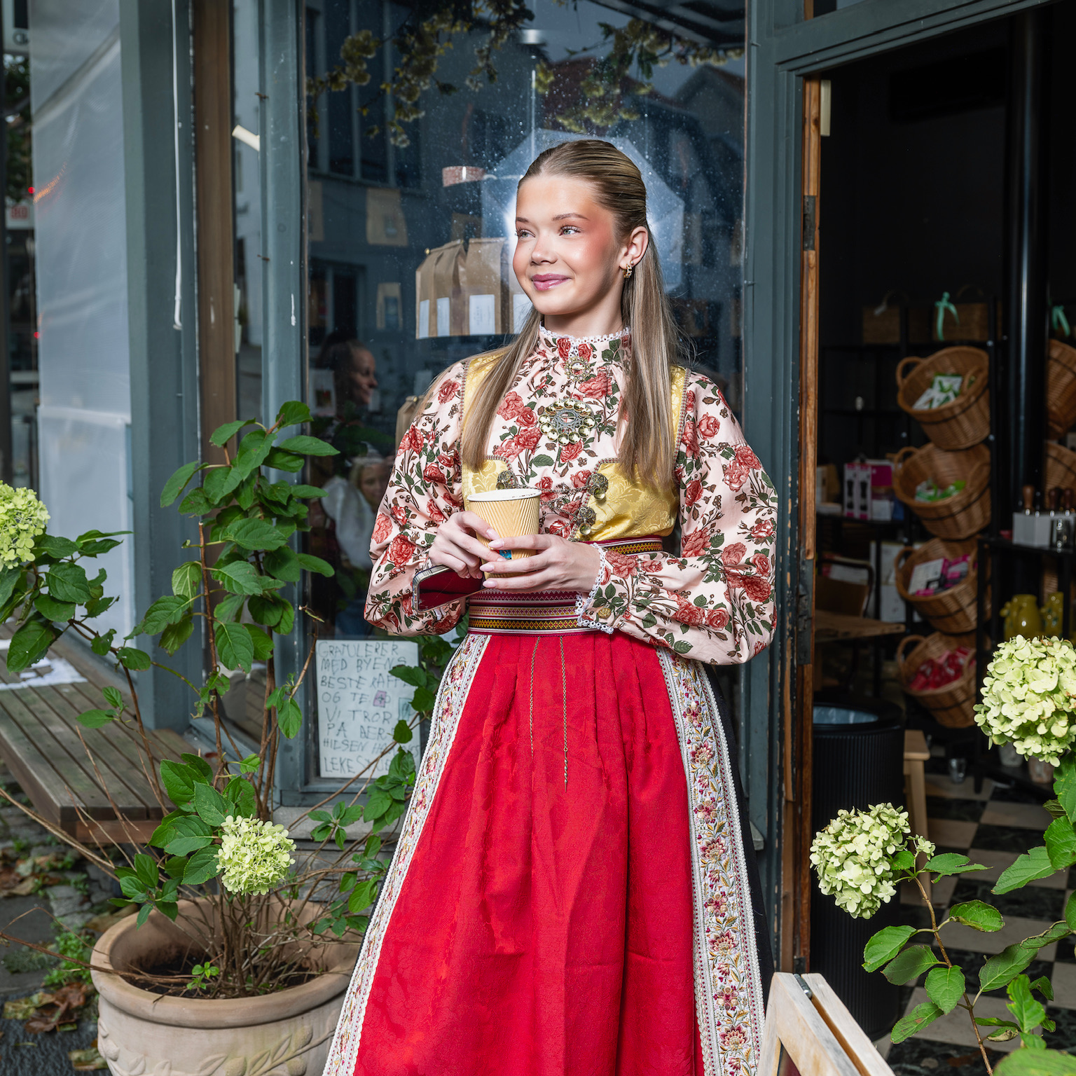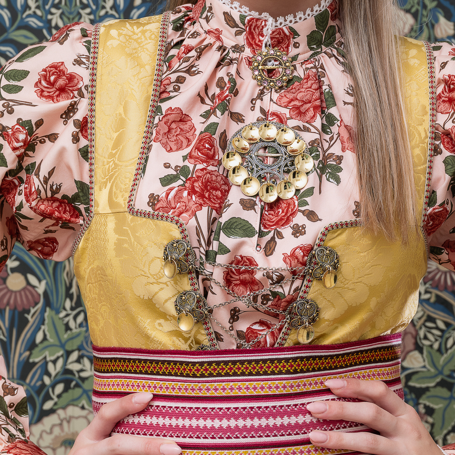 Vidunderlig bomullsskjorte med roser til bunad, drakt eller vanlig festantrekk.