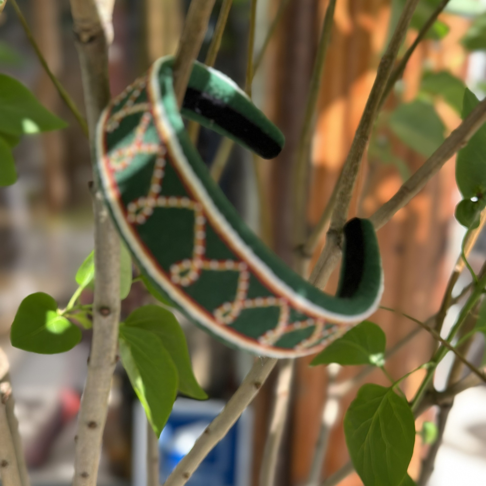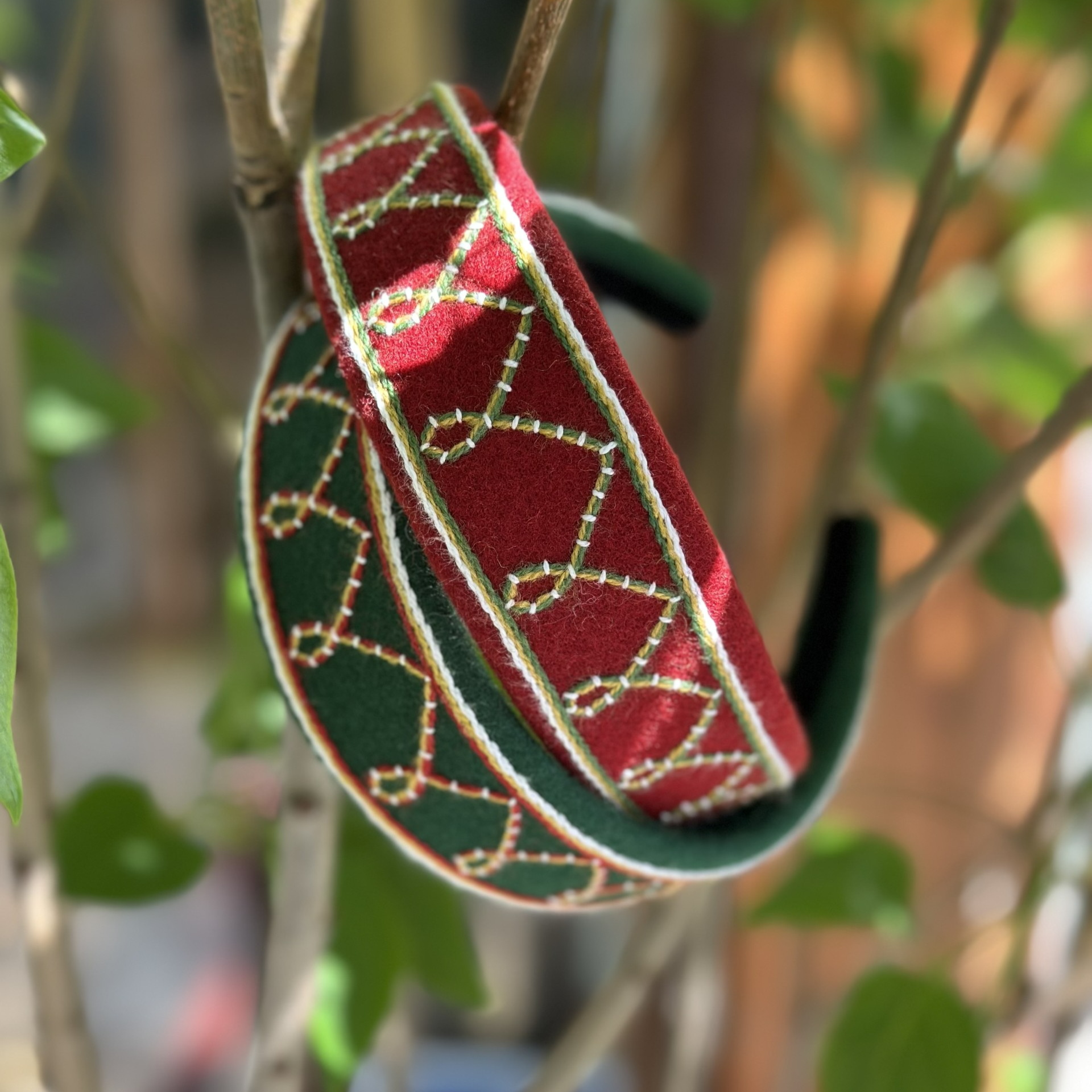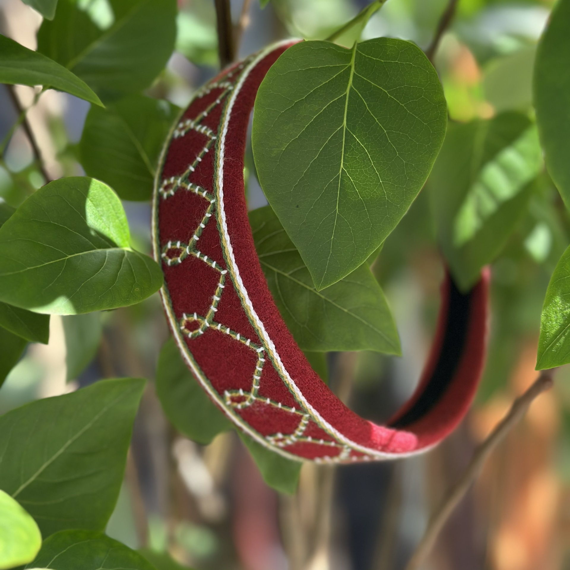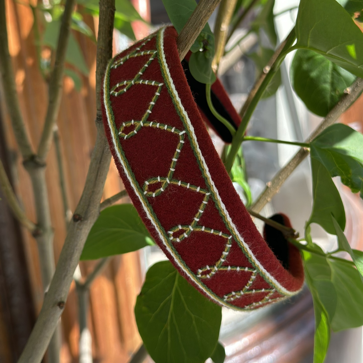 Hårbøyle til Sognebunad med håndbrodert mønster. Velg mellom grønn eller rød farge.